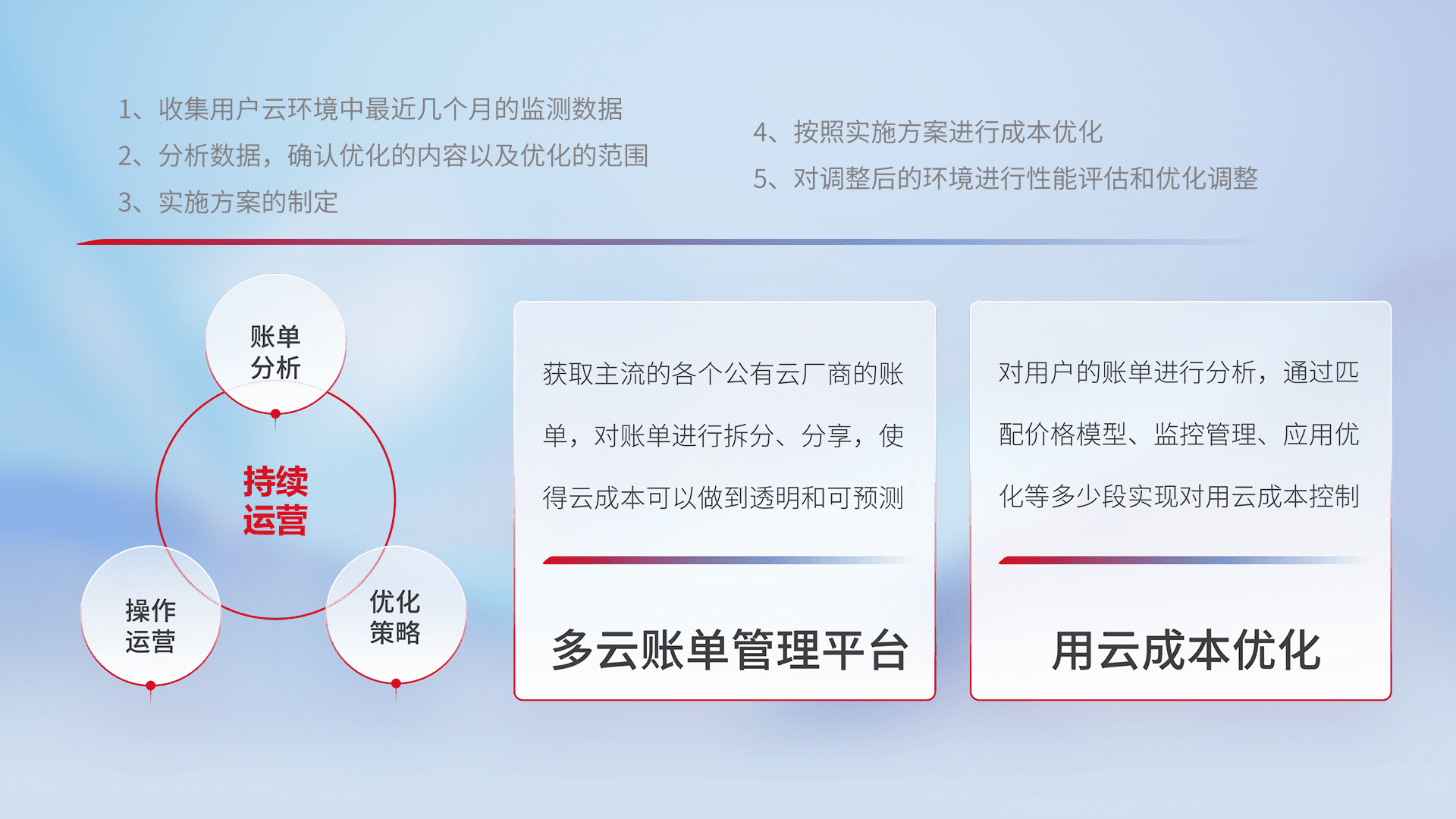 通过多云纳管,,,,以统一的资源数据模型把客户的云资源进行抽象和封装,,进而实现对多云资源的统一操作,,,,保障云资源管理的可靠性、、、稳定性与可用性。。。。量身定制化运维内容,,配置、、开发运维、、补丁管理、、、备份、、监控、、、认证和访问管理、、、、审计和日常巡检等,,保障在用云过程中的可靠度,,,稳定度以及高可用率。。。